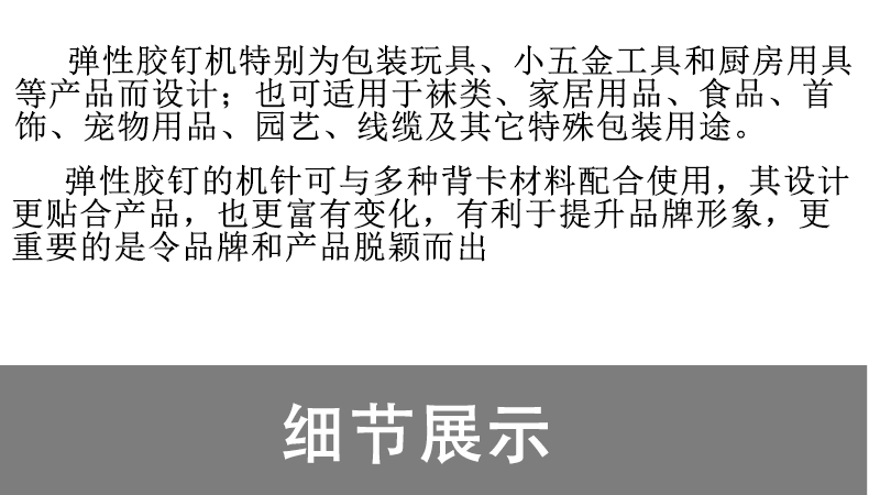 l 弹性胶钉机特别为包装玩具、小五金工具和厨房用具等产品而设计;也可适用于袜类、家居用品、食品、首饰、宠物用品、园艺、线缆及其它特殊包装用途。